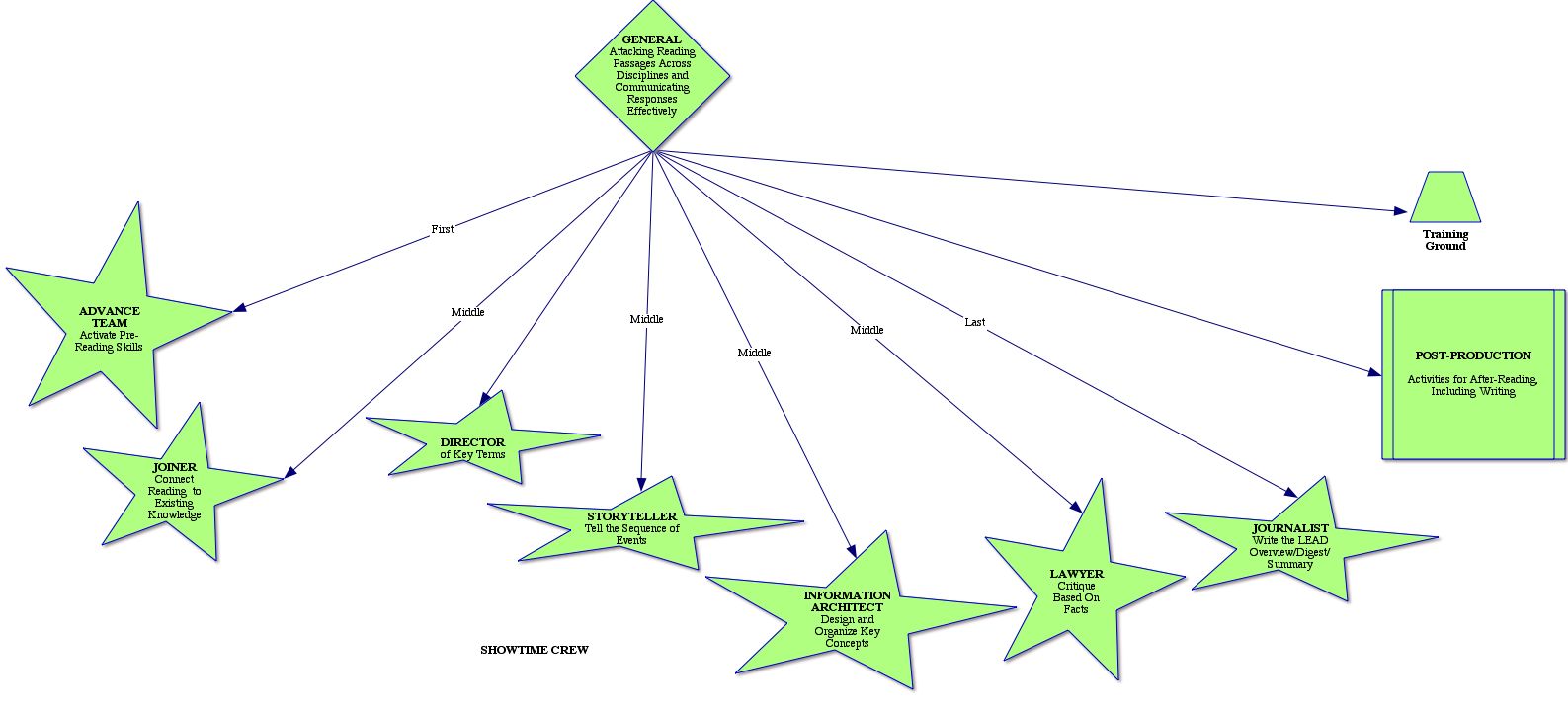 The team consists of a General, the Advance Team, the ShowTime Crew (the Joiner, the Director of Key Terms, the Storyteller, the Information Architect, the Lawyer, and the Journalist), the Post-Production Unit, and the Training Ground.